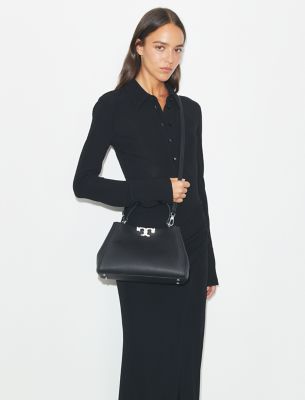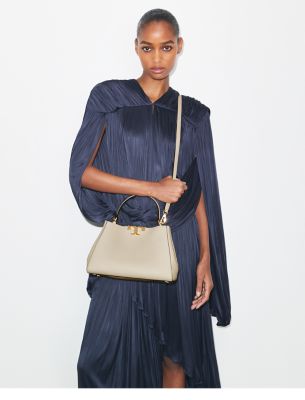 The Eleanor Satchel evolves with a more relaxed attitude. Crafted in soft pebbled leather with a refined grain and semi-matte finish, it has a gentle drape that creates an effortless sense of volume worn open or closed. Fully lined in rich suede, the interior has a center divide and flap pocket for organization. The sculptural curves of Double T hardware come together with a magnetic snap closure. A jewel of craftsmanship, designed to carry with ease — by the top handles or removable shoulder strap. Crafted in partnership with a Leather Working Group-certified tannery, supporting high standards in leather manufacturing and chemical management.• Height: 7.1″ (18cm); length: 10.6″ (27cm); depth: 4.3″ (11cm)