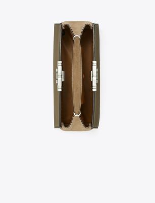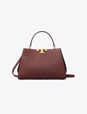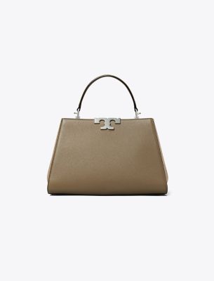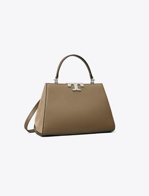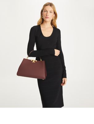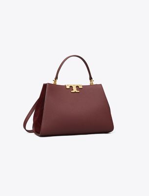 Our new Eleanor Satchel is made of leather with suede trim. Against clean, structured lines, the bold curves of sculptural hardware. A jewel of craftsmanship, designed to carry with ease — by the top handles or its removable crossbody strap.