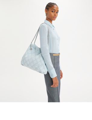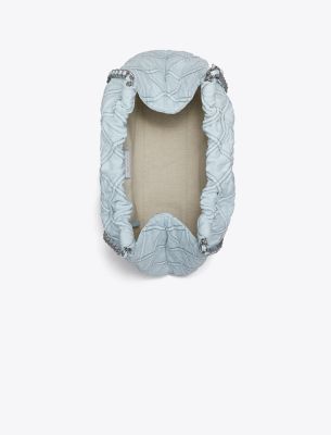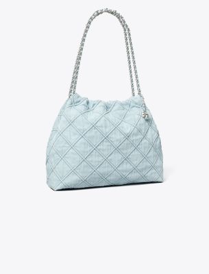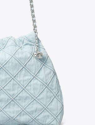 The Fleming Soft Denim Hobo Bag is made of cotton denim with diamond pattern pintucks and a chain strap laced with leather. • Height: 11.8″ (30cm); length: 14.2″ (36cm); depth: 4.1″ (10.5cm)