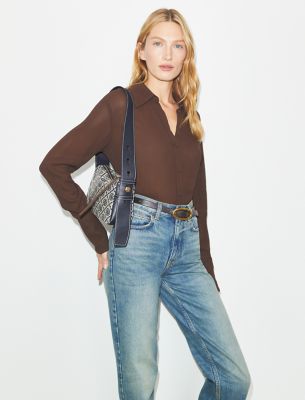 “The ultimate everyday handbag. Sculptural yet soft and easy on the go, the T Monogram Romy Shoulder Bag bag is crafted in our signature woven jacquard. Lightweight with a spacious interior organized with a deep zip pocket. A wide shoulder strap adjusts with our new button logo. • Height: 7.7″” (19.5cm); length: 12.2″” (31cm); depth: 3.2″” (8cm)