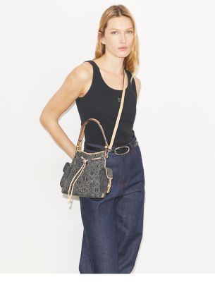 Our signature motif. The bucket bag is crafted in washed denim with a textured pattern. Designed with an adjustable top handle that can be worn over the shoulder and removable crossbody strap. Drawstrings are cinched with a metal logo cord stopper. Press and hold to loosen drawstrings and release to lock. Two exterior side pockets keep small items within easy reach.• Height: 8.4″ (21.2cm); length: 7.1″ (17.9cm); depth: 4.6″ (11.7cm) • 100% cotton denim; calf leather trim • Microfiber lining with a suede-like finish • Drawstring closure • Adjustable top handle with 6.1″ (15.5cm) drop; adjustable, removable crossbody strap with 19.7″ (50cm) drop • 2 exterior side pockets with magnetic snap closure • Attached zipper pouch • Protective metal feet • Dust bag included