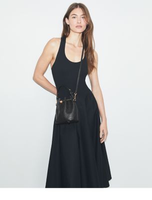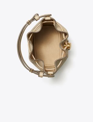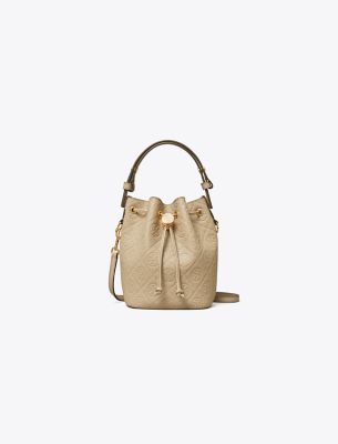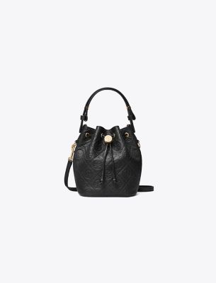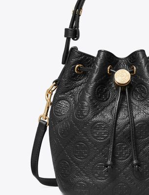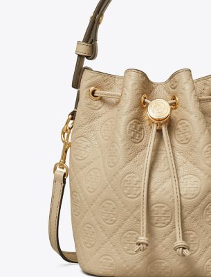 Our signature motif. The collection speaks to the timelessness of great style. The T Monogram Mini Bucket Bag is crafted in soft pebbled leather and our debossed pattern. Trimmed in fine leather and designed with an adjustable top handle that can be worn over the shoulder and a removable crossbody strap. Drawstrings are cinched with a metal logo cord stopper. Press and hold to loosen drawstrings and release to lock. Every detail is considered, with special attention to function and versatility.