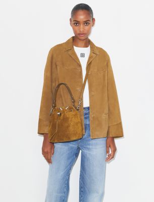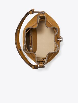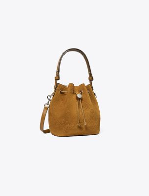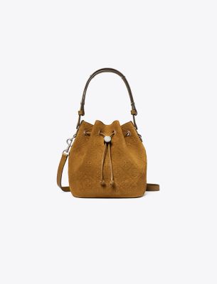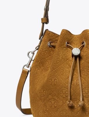 Our signature motif. The collection speaks to the timelessness of great style. The bucket bag is crafted in soft suede with an easy slouch and our debossed pattern. Designed with an adjustable top handle that can be worn over the shoulder and removable crossbody strap. Drawstrings are cinched with a metal logo cord stopper. Press and hold to loosen drawstrings and release to lock. A detachable zipper pouch keeps things organized. Crafted in partnership with a Leather Working Group-certified tannery, supporting high standards in leather manufacturing and chemical management.