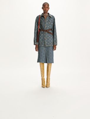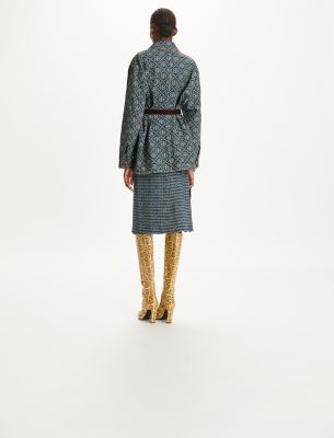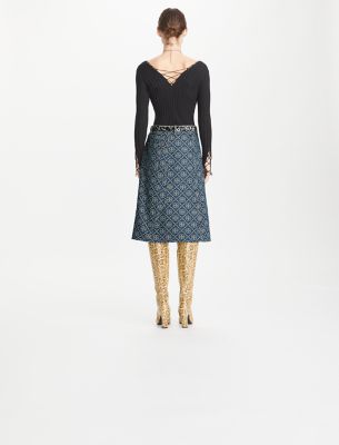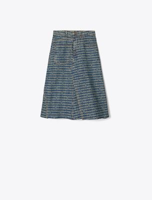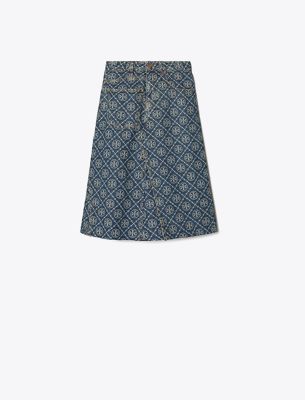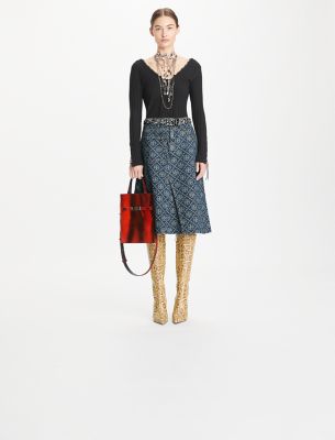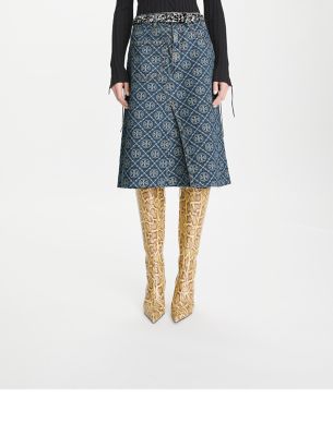 Denim with a Y2K twist – logo-flocked and designed to double up. Part of our Resort 2025 presentation, the classic denim A-line skirt is reimagined with the look of two jeans deconstructed and sewn together.