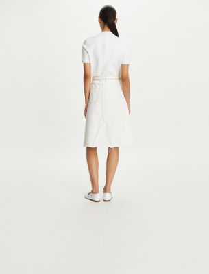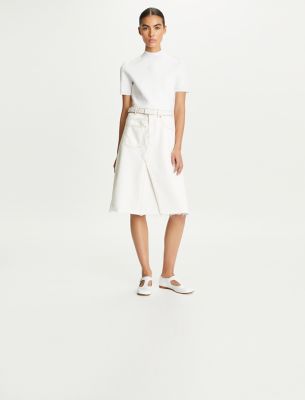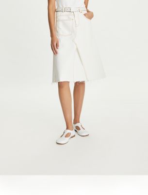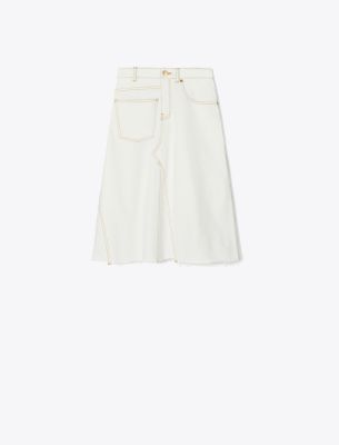 The classic denim A-line skirt is reimagined with the look of two jeans deconstructed and sewn together.