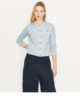 A tailored take on the ladylike sweater. The Kendra Cardigan is knit from super-soft merino wool with contrast trim and a smooth silk lining featuring our T Monogram. It is a polished and versatile layer to wear over everything from t-shirts to sweeping dresses.