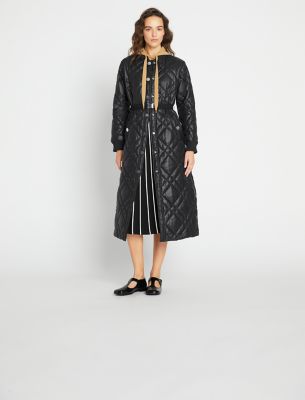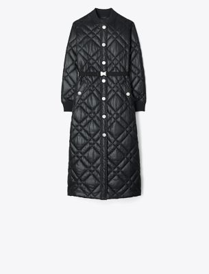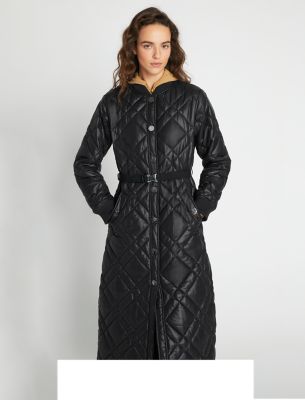 Our Loriner jacket is back. The long quilted outerwear features front snap closures and a removable jacquard belt. Engineered in weather-resistant nylon, it’s a perfect transitional layer.