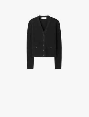 The v-neck cardigan is knit in our T Monogram jacquard. Designed with a slim fit, cropped silhouette and patch pockets at the waist. A versatile layer for any season.