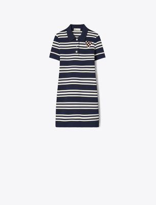 Inspired by classic golf polos, a striped, collared mini dress features a three-button placket and contrast heart patch. For the golf course and beyond.
