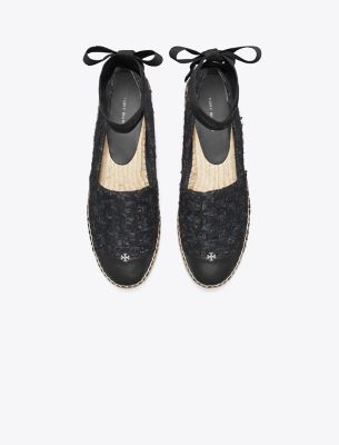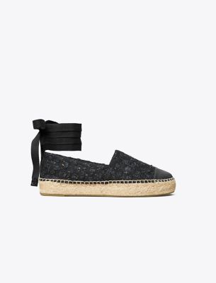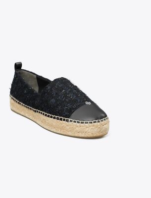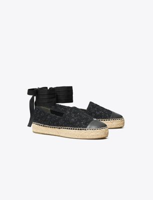 Mixed materials and a subtle lift elevate a laidback style. The cap-toe platform espadrille pairs retro-inspired bouclé tweed with the natural appeal of a jute footbed. Cotton straps wrap around the ankle, finishing the shoe with balletic detail.• 63% wool, 37% polyamide bouclé tweed upper; napa leather trim