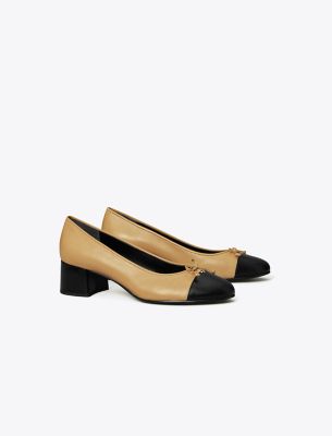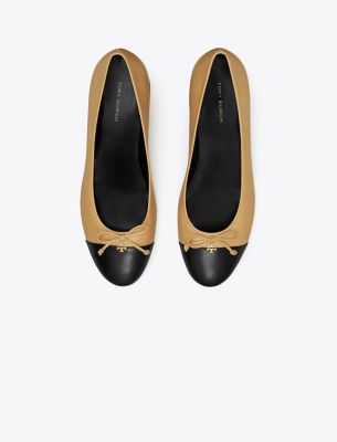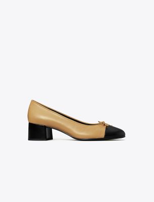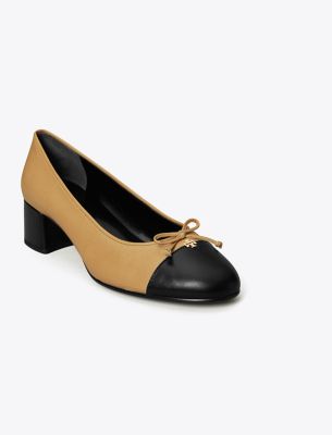 An elevated take on the classic ballet flat. This elegant pump is crafted in fine leather with a contrast cap toe and comfortable block heel. Finished with a delicate bow and subtle Double T for a signature finish.