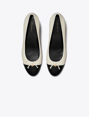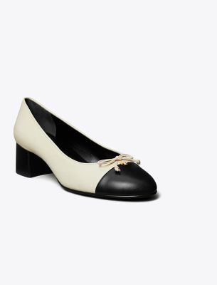 An elevated take on the classic ballet flat. This elegant pump is crafted in fine leather with a contrast cap toe and comfortable block heel. Finished with a delicate bow and subtle Double T.