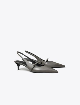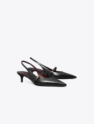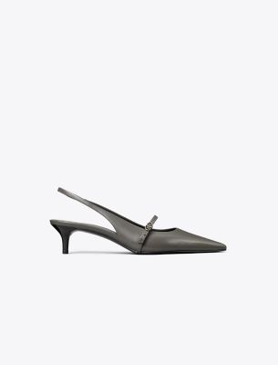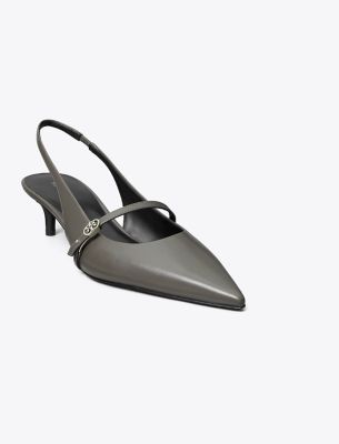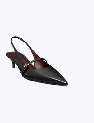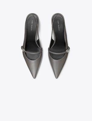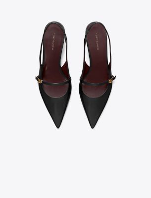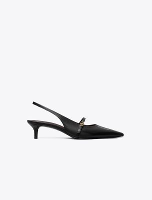 A Mary Jane with flattering lines and a low kitten heel. Featuring a pointed toe and slim, decorative Double T buckle strap, a slingback ankle strap secures the foot and a cushioned footbed adds comfort.Crafted in partnership with a Leather Working Group-certified tannery, supporting high standards in leather manufacturing and chemical management.• Approximately 1.77″ (45mm) lacquered ABS plastic heel