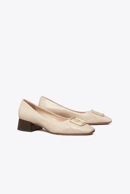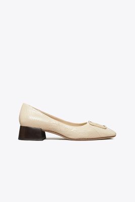 A square toe and square hardware in luxurious snakeskin. The Georgia Pump mixes tonal textures, designed with a Sixties block heel and a cushioned insole. Balance the volume of a loosely tailored suit with its angular shape.