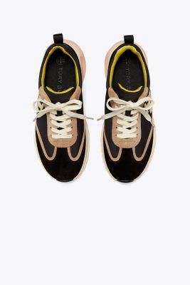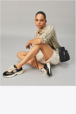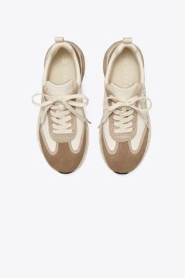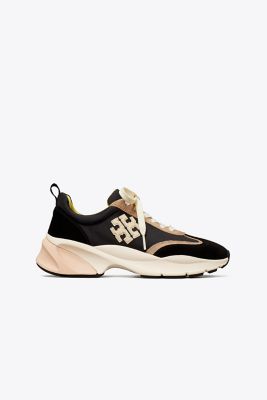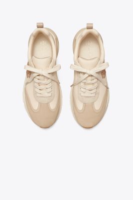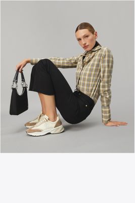 Our trainer combines flattering lines and comfort an oversized ergonomic sole with sculptural curves for lift, a deep ankle scoop that elongates the leg, and our Double T logo set at an angle. Innovative construction balances support and softness. A structural wishbone within the cushioned midsole acts as a cambrion, reinforcing the shoe’s internal support system.