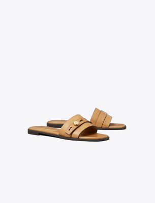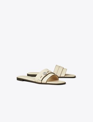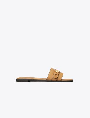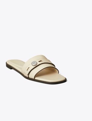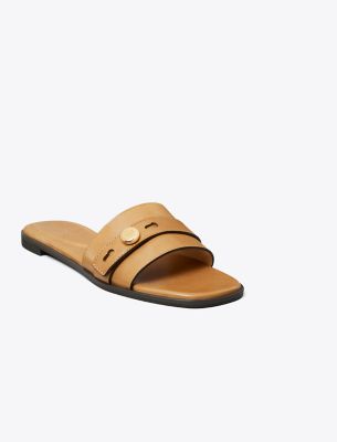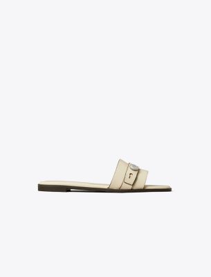 A minimal single-band flat inspired by the understated design of our signature handbag. The Romy slide features a belt-like detail with our logo button. Crafted in leather and set on a smooth, cushioned footbed.• Leather upper • Logo collar stud on strap • Cushioned leather footbed • Suede lining • Rubber sole • Dust bag included • Style number: 183305